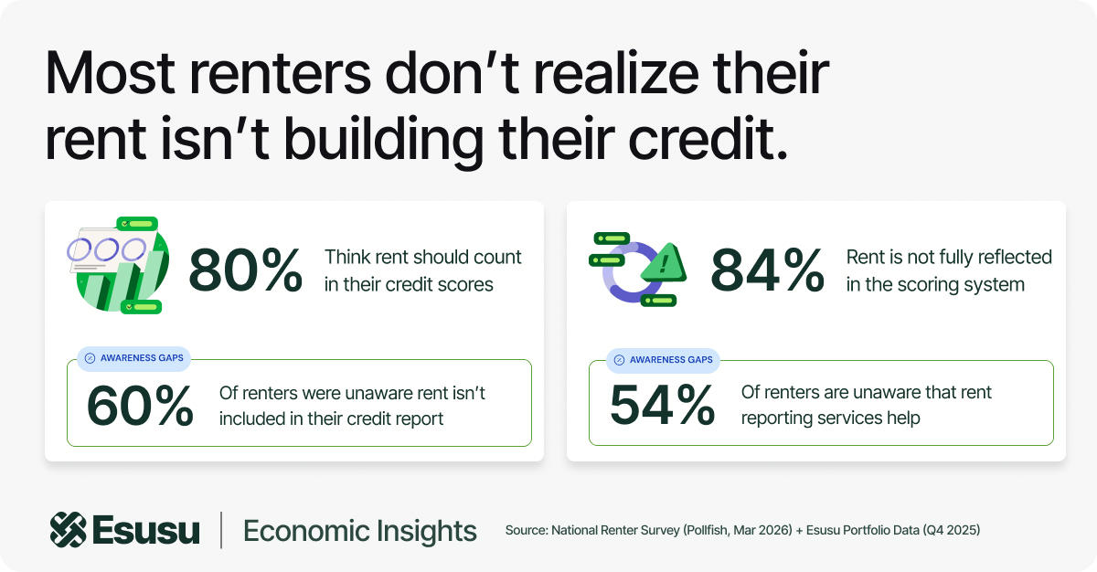 Today, we’re releasing new findings from a national survey of U.S. renters aged 18-80, revealing how renters, especially Gen Z, view credit, rent reporting, and the path to homeownership. The survey data comes alongside the launch of the Rent Worth Gap Report, which analyzes outcomes from 2.3 million renters, a subset of those enrolled in Esusu-powered reporting programs. You can read the full Rent Worth Gap Report here.